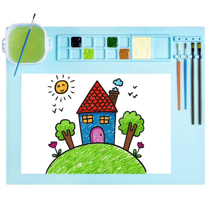 3. Denne opdaterede silikone kunstmåtte har to store runde malingsbakker til effektiv blanding, en sammenklappelig børsterensekop og muligheden for at blive brugt som malingpalet og -palle. Denne creatormåtte i silikone har skalaer til venstre og nederst, der er mere praktiske til din kunstneriske produktion.