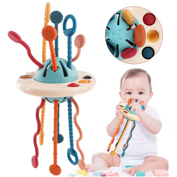 Lyse farver bruges i montessori ufo silikone-træklegetøjet for at stimulere babyens visuelle vækst. Flyets form gør det nemt for spædbørn at gribe og holde, at høre og opleve de forskellige lyde og vibrationer og trække ledningerne fra den ene side til den anden. Motoriske evner, sensorisk udforskning, finmotorik og hånd-øje-koordination fremmes ved at bruge teksturerede reb og greb.